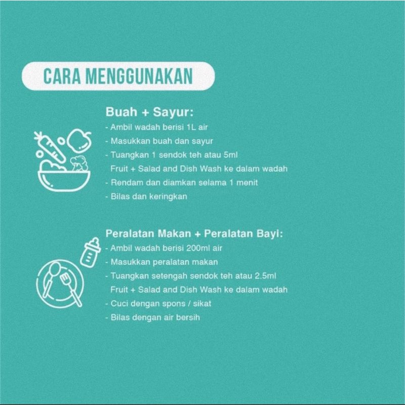 CARA MENGGUNAKAN: [Buah + Sayur] Ambil wadah berisi 1 liter air. Masukkan buah dan sayur yang mau dicuci. Lalu tambahkan dr soap FSD sebanyak 1 sendok teh atau kurang dari 5ml (disesuaikan dengan banyaknya buah dan sayur yang mau dicuci) ke dalam wadah. Diamkan saja dan rendam selama 1menit. Bilas dan keringkan.