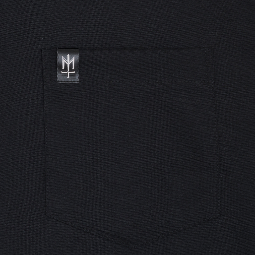 Black cotton long sleeves button-ups shirt with black plastic buttons and satin label.