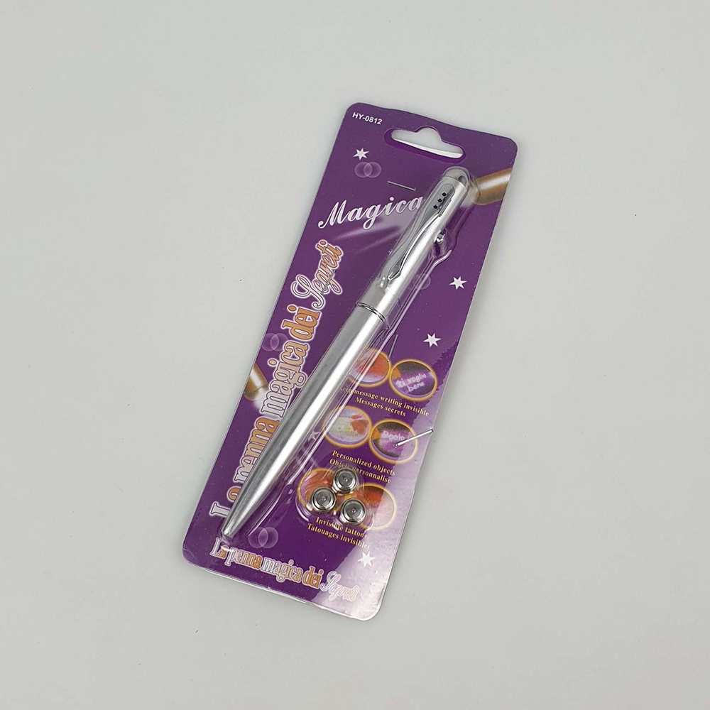Pena ini memiliki tinta invisible yang hanya bisa dilihat menggunakan sinar ultraviolet. Gunakan pena ini untuk menulis pesan rahasia atau untuk mengejutkan teman Anda dengan pena ajaib ini. Dilengkapi dengan sinar UV pada bagian belakang pena. Fitur