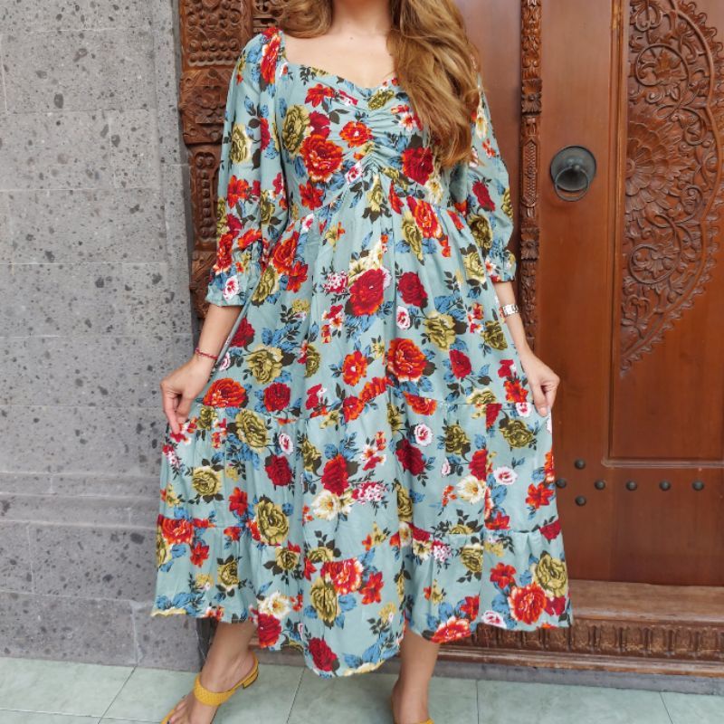 ukuran : LD : 98-100 Panjang dress : 110 Double rample / tangan balon / ada karet d bagian bawah tangannya