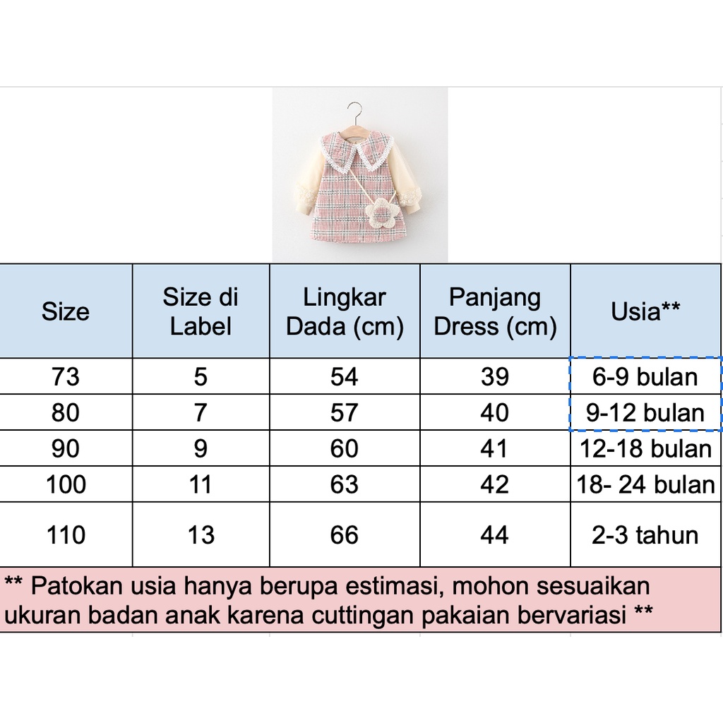 📌Detail ukuran A: - 73 (6-9bln) Ld: 54cm, Panjang Dress : 39cm, Tinggi Badan: <73cm - 80 (9-12bln) Ld: 57cm, Panjang Dress : 40cm, Tinggi Badan: 73-80cm - 90 (12-18bln) Ld: 60cm, Panjang Dress : 41cm, Tinggi Badan: 80-90cm - 100 (18-24bln) Ld: 63cm, Panjang Dress : 42cm, Tinggi Badan: 90-100cm - 110 (2-3thn) Ld: 66cm, Panjang Dress : 44cm, Tinggi Badan: 100-110cm