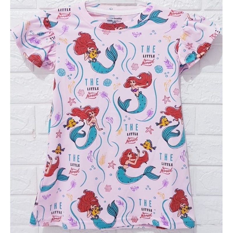 Dress anak perempuan dengan lengan rumbai. Motif motifnya lucu, sangat cocok untuk sehari-hari di rumah.