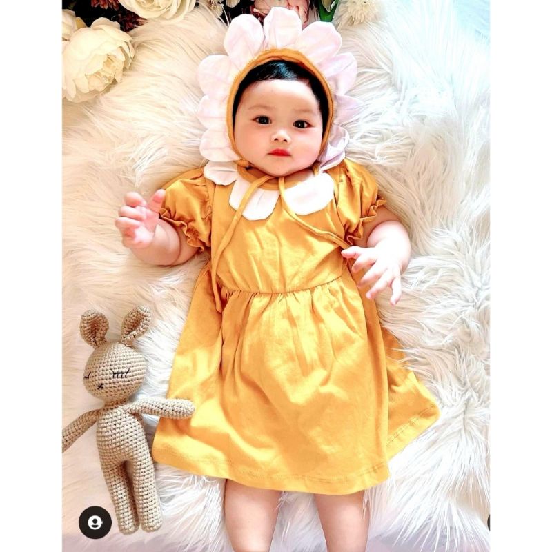 dress menggunakan kain cotton combed 30s yang lembut dan adem. dapat bonus topi bonnet senada dengan dressnya yang nyaman dipakai baby.