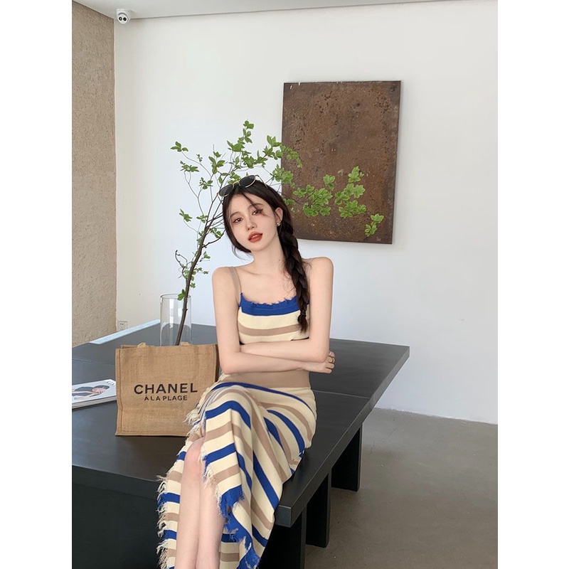 Detail dress floral korea Gaun Suspender Rajut Bergaris Wanita, Rok Panjang Belahan Pinggang Ketat Musim Pa