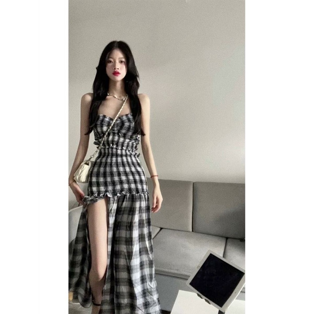 Detail dress floral korea Gaun Panjang Kotak-kotak Hitam Tanpa Lengan Wanita, Gaun Musim Panas Retro Pingga