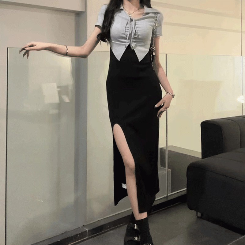 Detail dress floral korea Pure Desire Gaun Wanita, Dress Lengan Pendek Terpisah Dua Potong2023Rok Super Ped