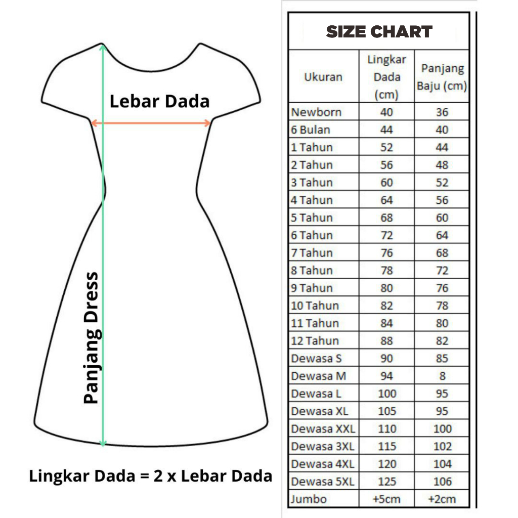 Ukuran Lingkar dada/Panjang dress/Panjang gamis Tabel Ukuran: