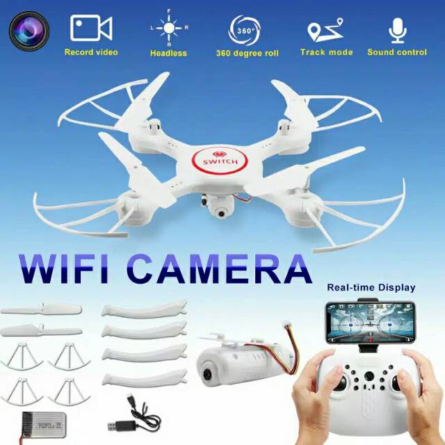 Drone Sesuai Gambar PxLxT = 22x22x18cm FITUR: - Camera FVP Photo & Video (Tombol Kontroler) - Berputar 360 derajat: quadcopter dapat berputar ke depan/belakang/ke kiri/ke kanan mengikuti perintah anda - Mode headless: membantu pilot dalam masalah "kehilangan arah" - Satu tombol kembali otomatis: kamu dapat memanggil kembali quadcopter dengan cepat dan aman - Sistem control 2.4 GHz: memastikan tanpa gangguan sinyal dan sinyal lebih kuat - 6 axis gyro: menyediakan stabilitas terbaik selama penerbangan di dalam dan di luar ruangan - Lampu LED penuh warna: drone dapat bersinar di dalam kegelapan, memperlihatkan kamu penerbangan yang baik dan memberikan tampilan yang indah