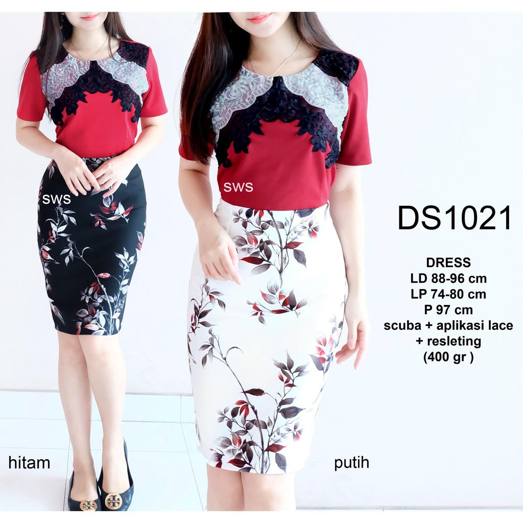 Detail DS1021 - DRESS PESTA LACE MIDI SEPAN DRESS SCUBA BRUKAT IMPORT BIGSIZE XL NATAL