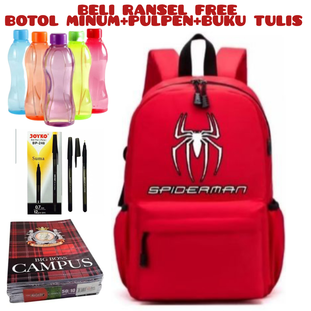 DT_123_Beli 1 Dapat 4- Tas sekolah spiderman anak laki-laki anak perempuan back pack sekolah anak tk sd_Beli Ransel Free Botol Minum+Pulpen+Buku Tulis