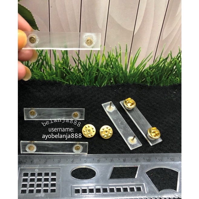 Dudukan paku name tag akrilik bening plus manset kupu2 satuan