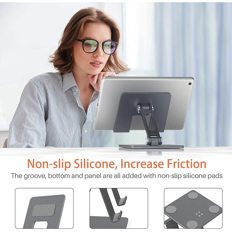 Dudukan ini memiliki ukuran yang cocok digunakan untuk tablet 4 hingga 15.6 Inci. Materialnya terbuat dari paduan aluminium sehingga kuat dan kokoh. Balutan warna gray pada rangka membuat produk ini terlihat premium dan berkelas, cocok untuk dijadikan sebagai dekorasi di meja kerja Anda.