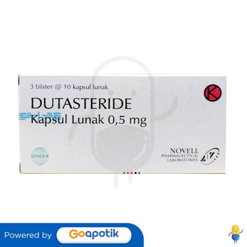 Deskripsi : PENGGUNAAN OBAT INI HARUS SESUAI PETUNJUK DOKTER. obat yang digunakan untuk pasien Benign prostatic hyperplasia (BPH). | Komposisi : Tiap kapsul lunak mengandung: Dutasteride 0.5 mg | Dosis : ATURAN PAKAI HARUS DENGAN PETUNJUK DOKTER.Benign prostatic hyperplasia (BPH): Dewasa: 500 mcg 1 kali sehari selama minimal 6 bulan | Indikasi : Untuk penderita Benign prostatic hyperplasia (BPH) | Perhatian Khusus : Hindari donor darah selama pengobatan dan paling tidak 6 bulan setelah penghentian pengobatan. | Kemasan : Dus, blister @ 10 kapsul lunak | NIE : GKL1833540702A1