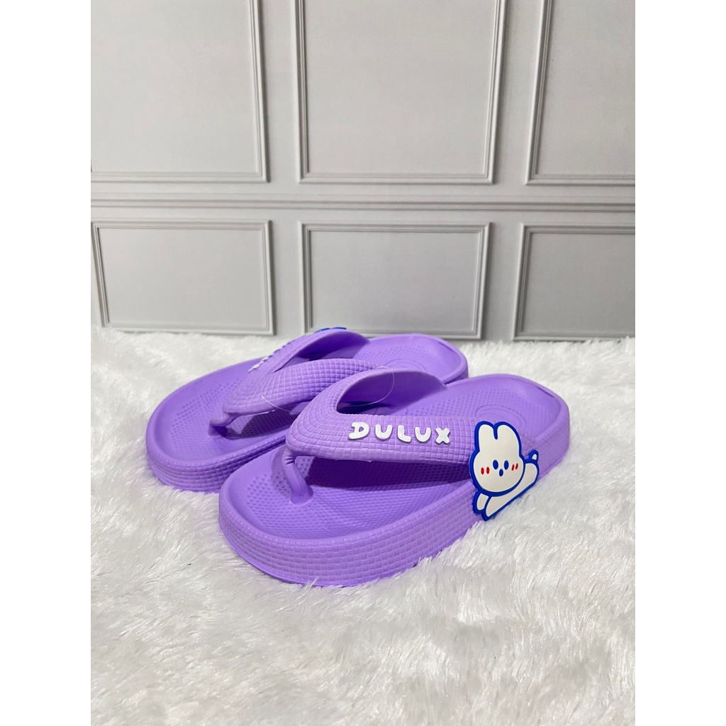 - Merek : DULUX - Model : 510C - Sandal Jepit - Size : 30-35 - Warna : Pink, Ungu Muda, Putih, Tosca, Ungu Tua - Bahan : Karet, Elastis, Kuat, Tidak Licin, dan Empuk