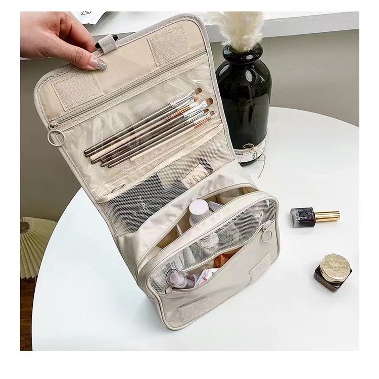Easy Travel Make Up Bag Deskripsi Bahan: Nilon waterproof Ukuran: 24cm*18cm*10cm Fungsi khusus: bisa digantung (hanger) Varian: cream, black, gray, navyblue Mengorganisir skin care dan make up tools dengan simpel, rapi dan hemat tempat.