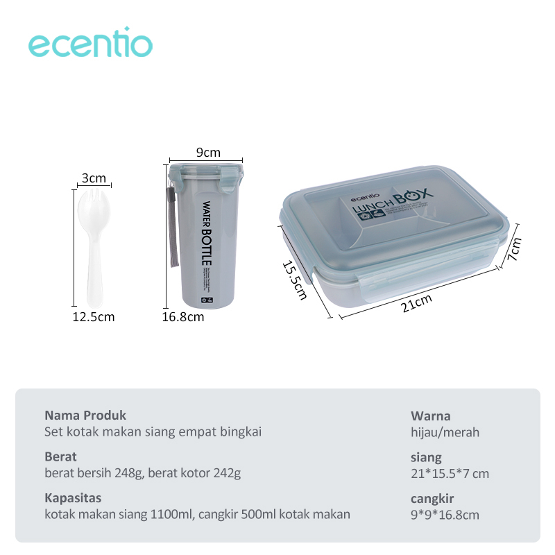 ecentio 2 bagian kotak makan siang plastik 4 kompartemen berwarna terang Bahan: PP Warna: abu-abu / merah muda / hijau Kapasitas: kotak makan siang 1100ml, cangkir 500ml Ukuran produk: kotak makan siang 21 * 15,5 * 7cm, cangkir 9 * 9 * 16,8cm Ukuran kemasan: 20 * 21 * 7cm Berat: Berat bersih 248g, Berat kotor 252g Daftar kemasan: kotak makan siang * 1PCS, cangkir * 1PCS, tali pembawa cangkir * 1PCS, garpu dan sendok * 1PCS ------------------------------ 💥ecentio Philosophy : " Your essentials" 💥Penjualan merek kotak makan siang Indonesia TOP1 👍Penjualan lebih dari 6000000 pcs 👍Direkomendasikan oleh Sarwendah (Artis) 👍Pengemasan 24 jam 👍 GARANSI KERUSAKAN 30 HARI (KITA GANTI) 👍 GARANSI BOCOR KHUSUS LUNCH BOX 30 HARI (KITA GANTI) 👍GARANSI MESIN 30 HARI ------------------------------ 🙋【Catatan Pembelian】🙋 Jika Anda memiliki masalah atau cacat pada barang yang diterima, silakan ambil gambar dan kirimkan ke layanan pelanggan di obrolan. Tolong jangan langsung berkomentar, kami akan mencoba yang terbaik untuk menanganinya untuk Anda.