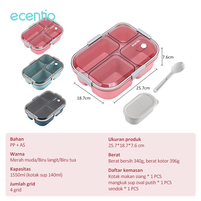 ⭐. Disegel dan anti bocor, kapasitas besar 1550ml empat grid ⭐. Tersedia wadah saus individu 100ml ⭐. Tersedia dengan spork lipat ⭐. Bahan PP yang aman, dapat digunakan untuk menampung berbagai bahan, aman dihangatkan ke microwave