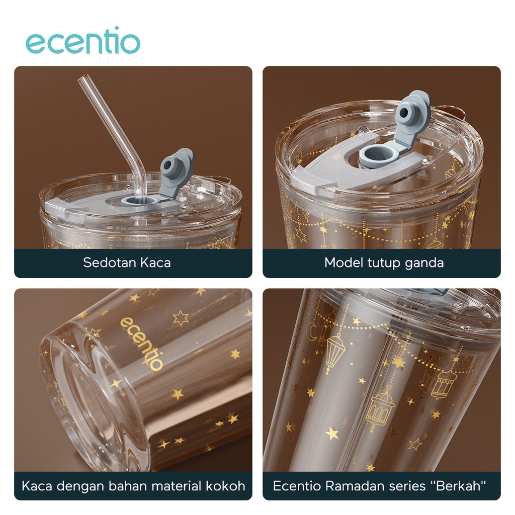 1.Sedotan Kaca 2.Botol minum dengan model tutup ganda 3.Kaca dengan bahan material kokoh 4.Ecentio Ramadan series "Berkah"