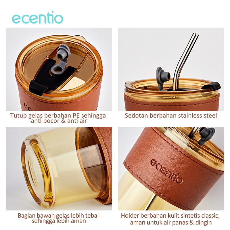 ⭐. Kaca berkualitas tinggi, sehat & ramah lingkungan ⭐. 2 cara peenggunaan, dengan atau tanpa sedotan sangat aman ⭐. Bagian bawah gelas lebih tebal sehingga lebih aman ⭐. Tutup gelas berbahan PE sehingga anti bocor & anti air ⭐. Holder berbahan kulit sintetis classic, aman untuk air panas & dingin ⭐. Sedotan berbahan stainless steel ⭐. Mudah dibersihkan
