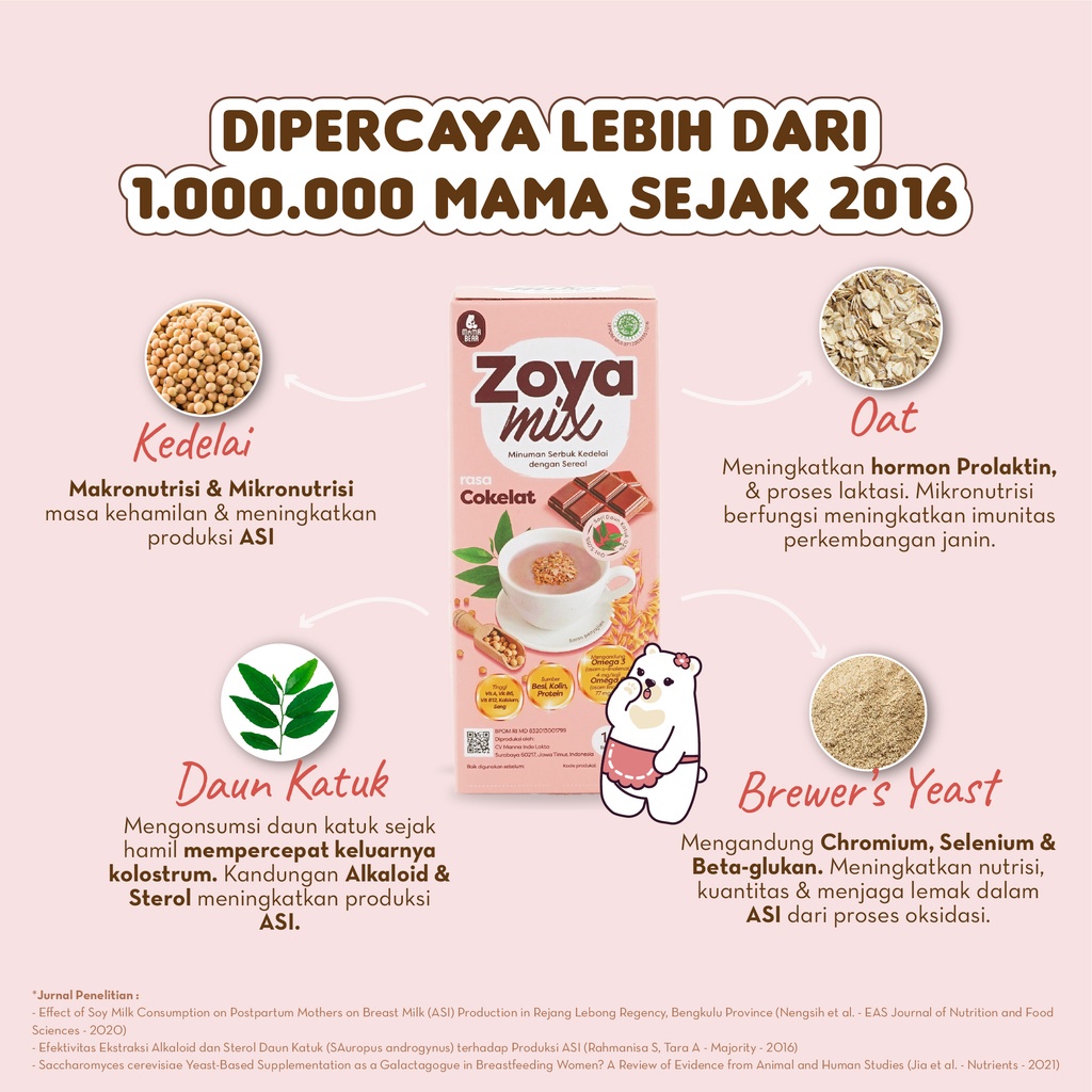 * ZOYA MIX Rasa Pisang, Melon, dan Cokelat ❤ KEDELAI : sumber protein, vitamin B6, menstimulasi hormon oksitosin, meningkatkan produksi ASI ❤ OAT : serat, antioksidan, kaya zat besi mencegah anemia, & menstimulasi hormon oksitosin, melancarkan ASI ❤ DAUN KATUK : kandungan alkaloid dan sterol untuk meningkatkan produksi ASI ❤ EKSTRAK RAGI (brewer's yeast): tinggi asam amino & antioksidan