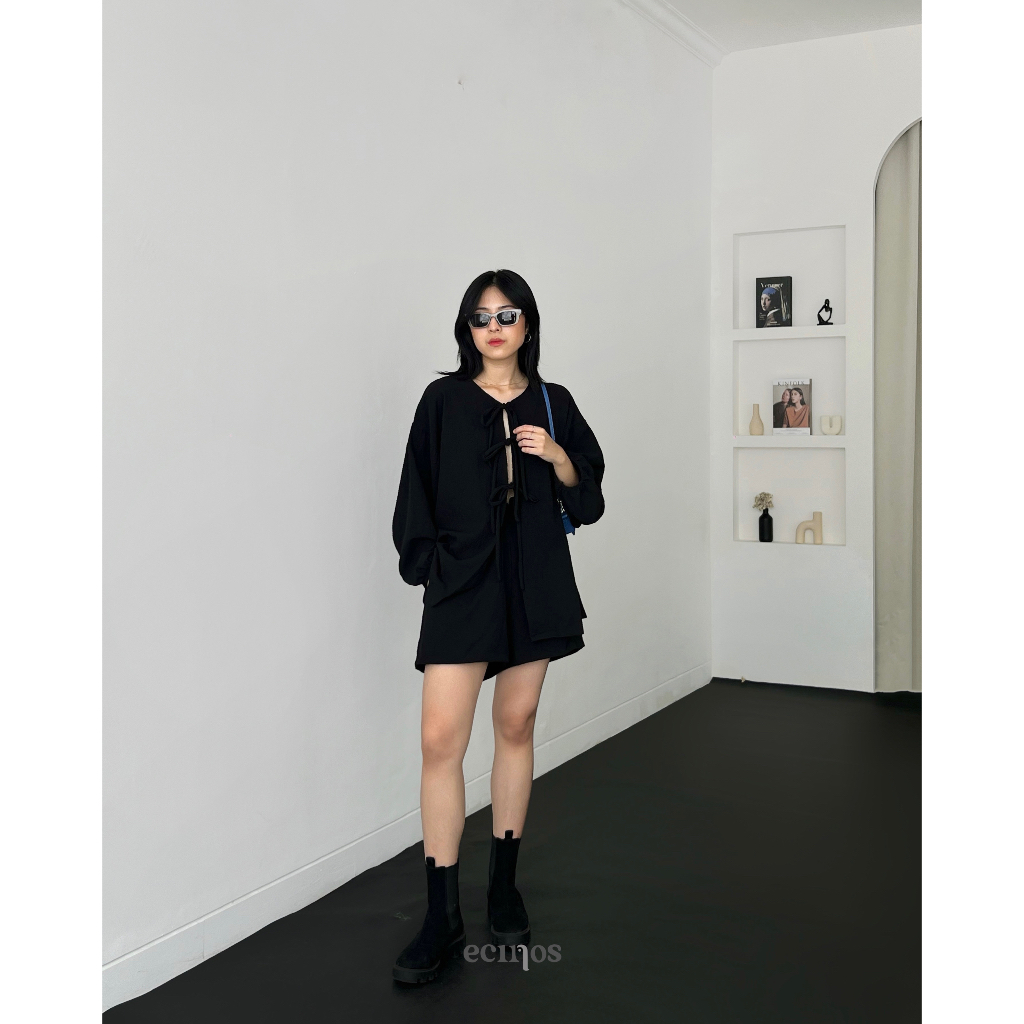 β 5 colors: Black | White | Sand | Blue | Shadow β Size: β’ Top: Bust (LD): 122 | Length (P): 70 β’ Shorts: Waist (L.Pinggang): 60-100 | Length (P): 42 | Hip (L.Pinggul): 102 | Thigh (L.Paha): 77