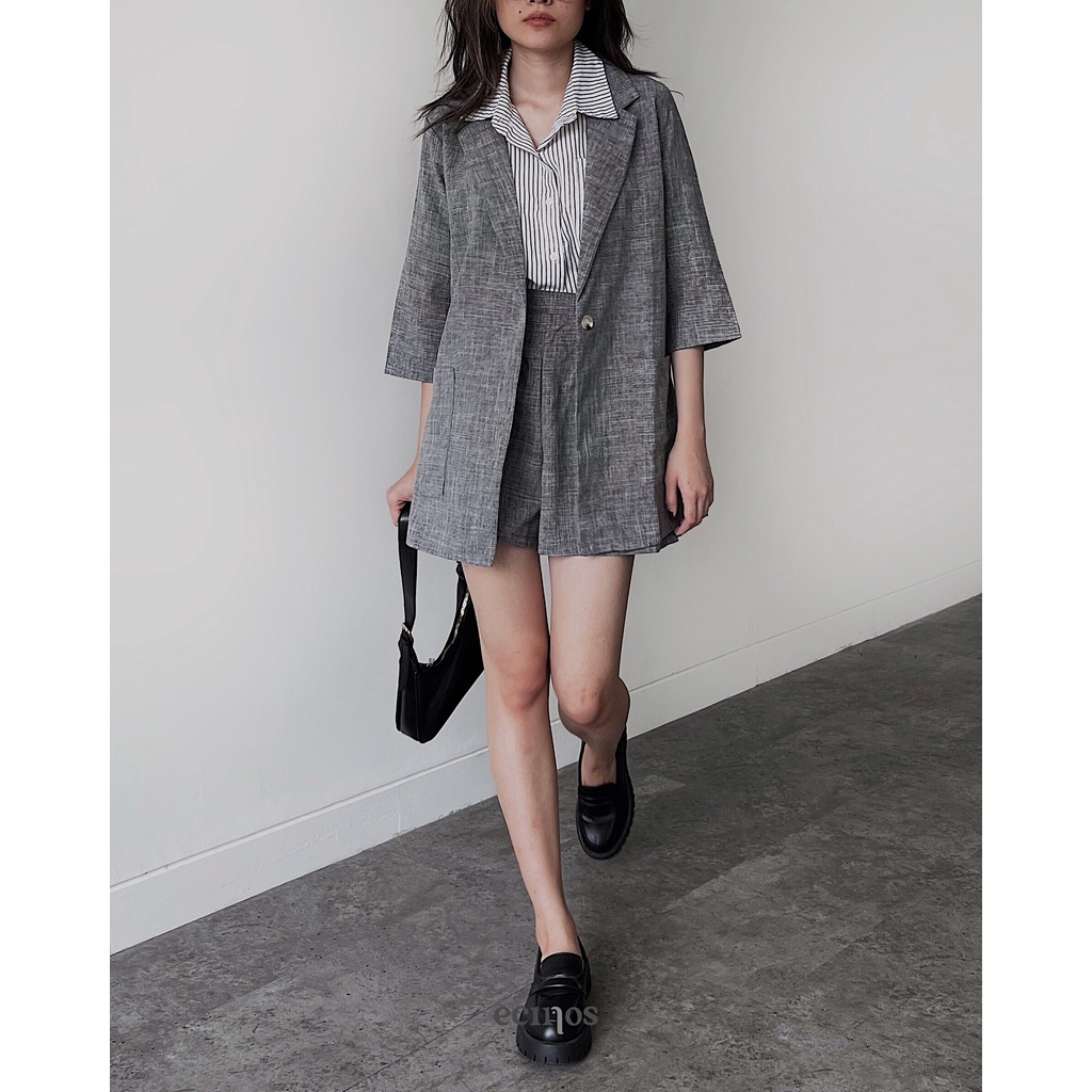 — Options: Blazer only | Shorts only | Set — 6 warna : Black | Blue | Grey | Beige | Tortilla | Dark Grey — Size details Blazer; Bust (LD): 108 | Length (P): 76 — Size details Bottom; Waist (lingkar pinggang): 66-98 | Length (P): 38 | Thigh (Lingkar Paha): 72 | Hip (Lingkar Pinggul): 102 — Oversized | Chic | Essential — Model is 165cm