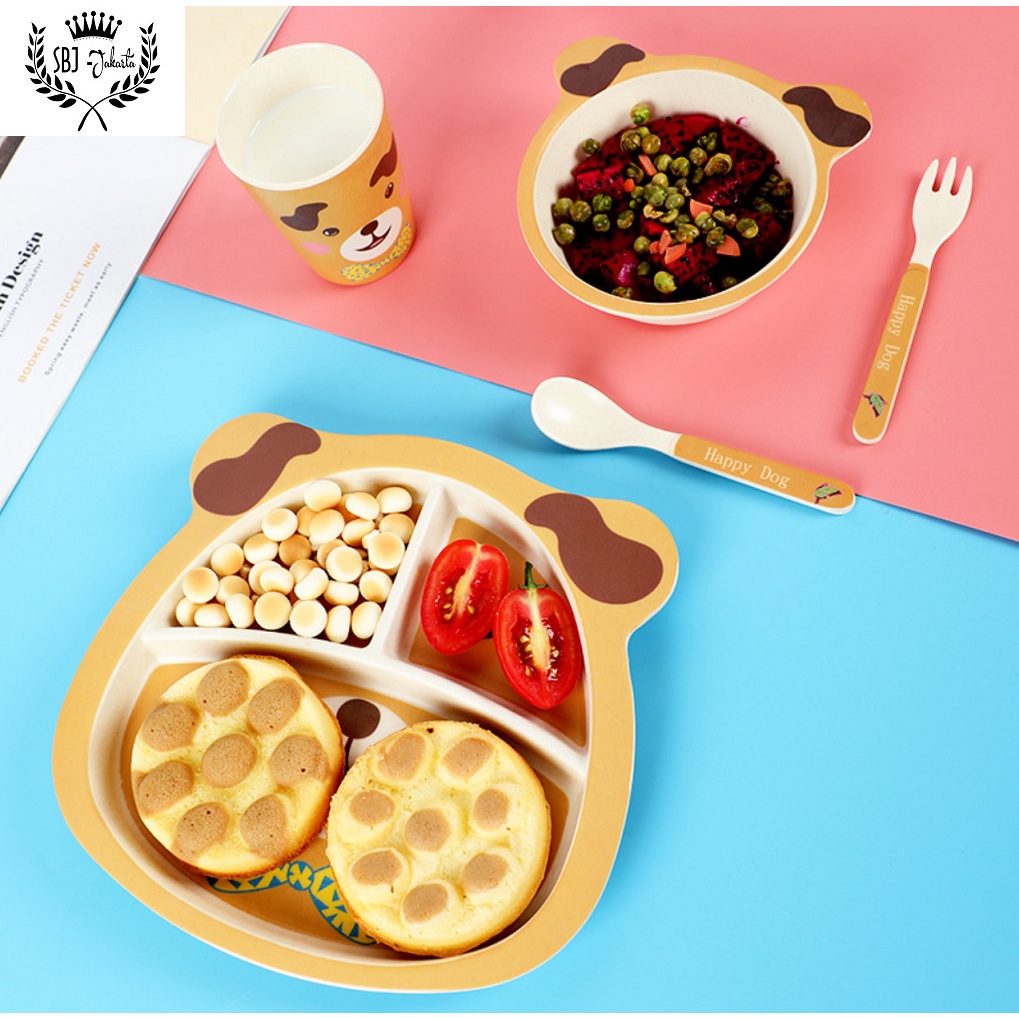 - Set Piring alat makan anak Bamboo Fiber Tableware - Material Eco Green Bamboo Fiber BPA Free Food Grade - 1 Set terdiri dari Piring, Mangkuk, Gelas, sendok dan Garpu dengan kemasan pabrik 1 set - Dengan Motif karakter Happy Animal Sesuai varian yg kita buat - Ukuran Sesuai foto di etalase
