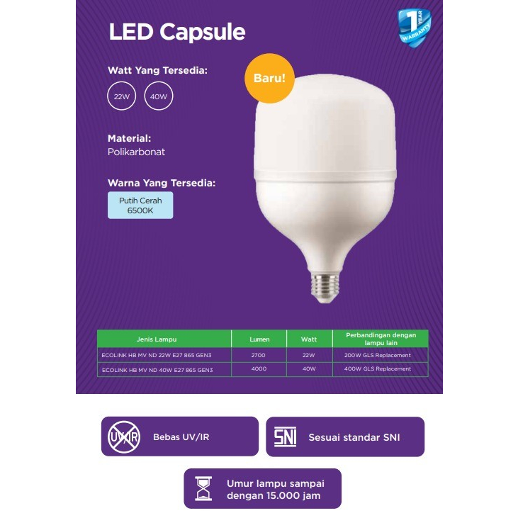 Keunggulan: • Lebih terang • Tahan terhadap naik turun tegangan listrik • Hemat energi hingga 90%