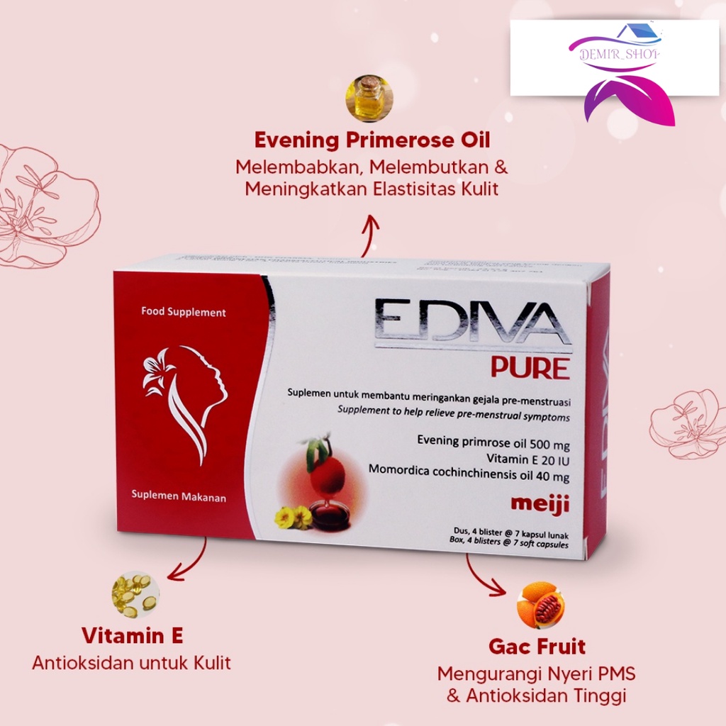 EDIVA Pure merupakan suplemen berbentuk kapsul lunak yang dapat membantu meringankan gelaja Pre-Menstruasi, karena dapat berfungsi untuk menyeimbangkan hormon wanita.