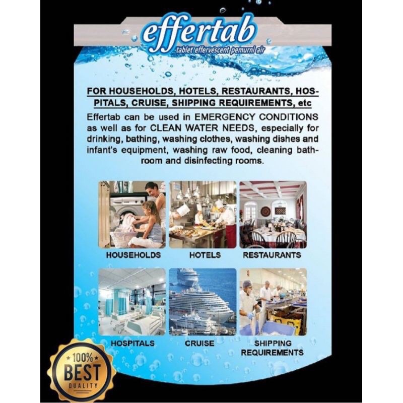 Kegunaan Effertab yaitu untuk menangani kondisi darurat maupun untuk kebutuhan air bersih, antara lain untuk air minum, mencuci baju, mencuci piring dan perlengkapan bayi, mencuci bahan makanan, mandi, desinfektan dinding, lantai ruangan dan lain-lain. Bisa mematikan jentik nyamuk di dalam air bak. Bisa untuk menghilangkan jamur pada kaca. Mengurangi lumut. Menghilangkan bau pada air.
