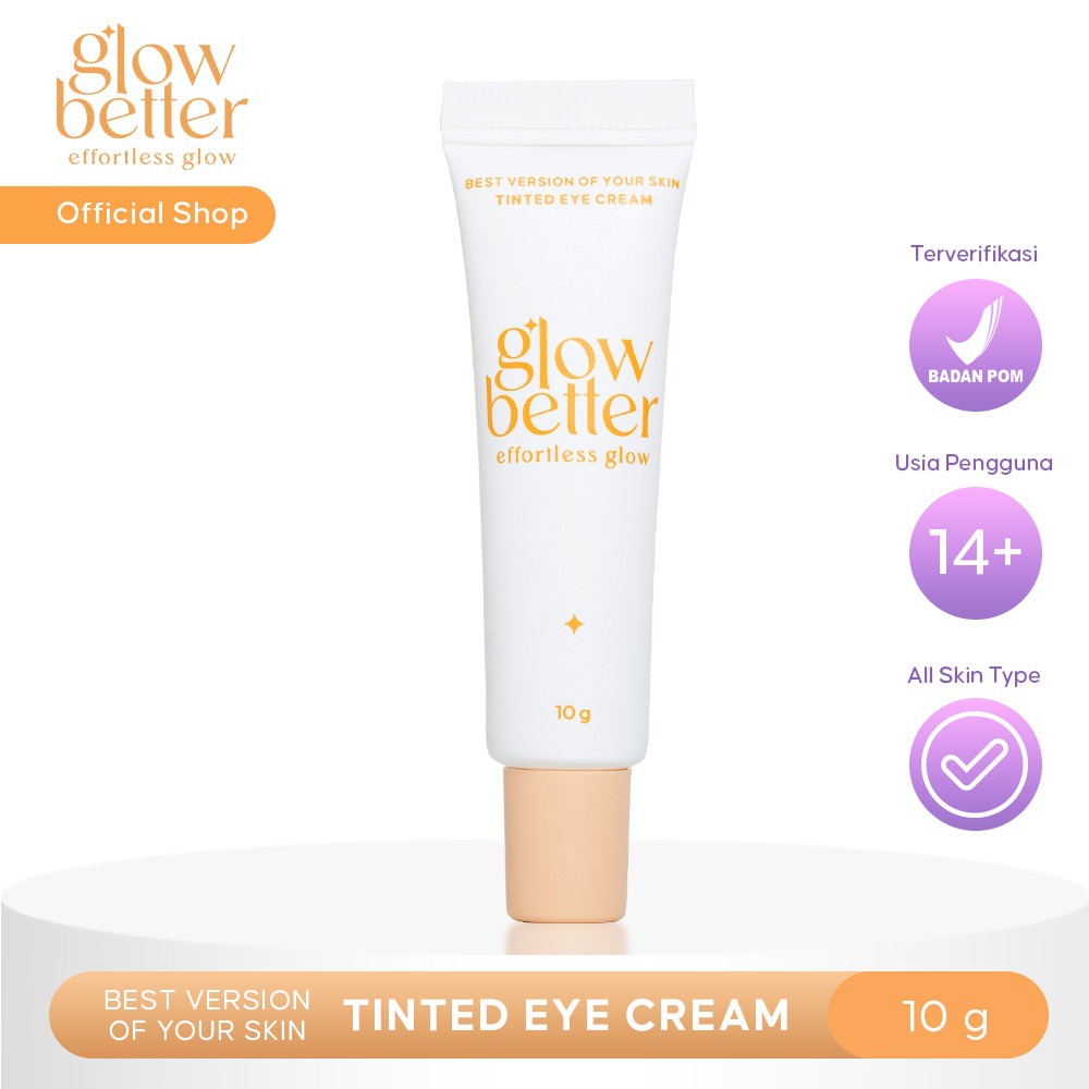 Glow Better The Best Version of Your Skin: Tinted Eye Cream adalah serum untuk area mata, khususnya area bawah mata, dengan coverage ringan yang dapat membantu untuk: - memudarkan garis halus dan kerutan, - mencerahkan, - mengencangkan area bawah mata, dan - berperan sebagai anti-aging untuk area bawah mata.