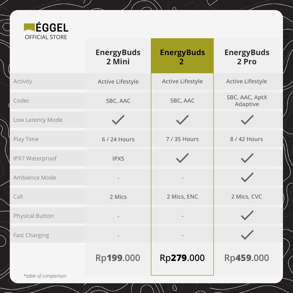 ◉ IPX7 Secure + Comfort Fit EnergyBuds dapat menahan semprotan air dan keringat, berkat sertifikasi IPX7 waterproof. Dengan berat hanya 4.5 gram dan ukuran yang kecil, kamu hampir tidak merasakan earbuds di kupingmu