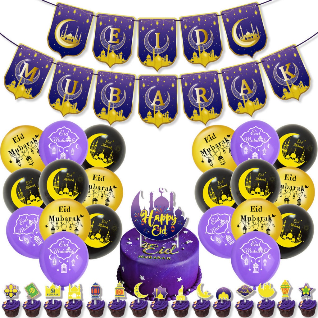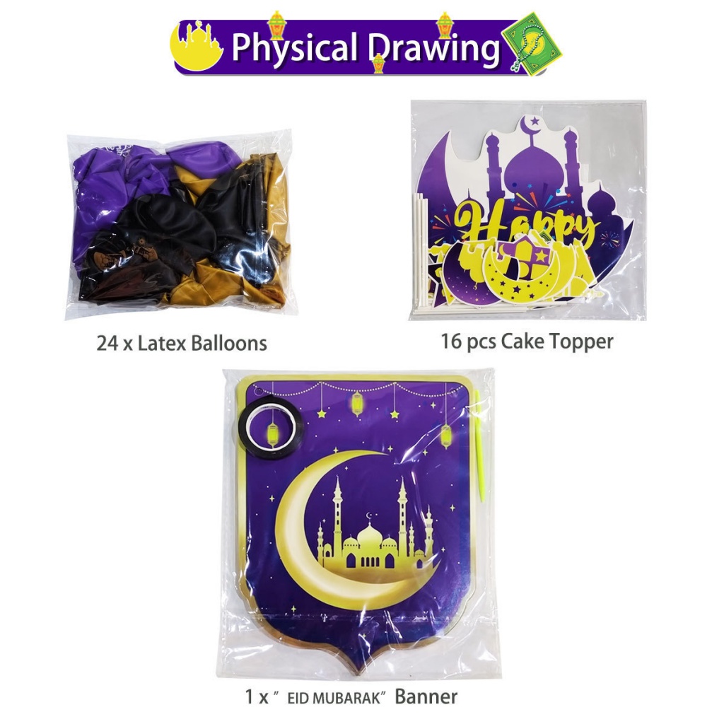 Video perkenalan produk Eid Mubarak 2023 New Party Decoration Eid Mubarak Flag Balloon Cake Insert Layout Supplies Eid Mubarak Moon Star Balloon Set. Sumber: Shopee.