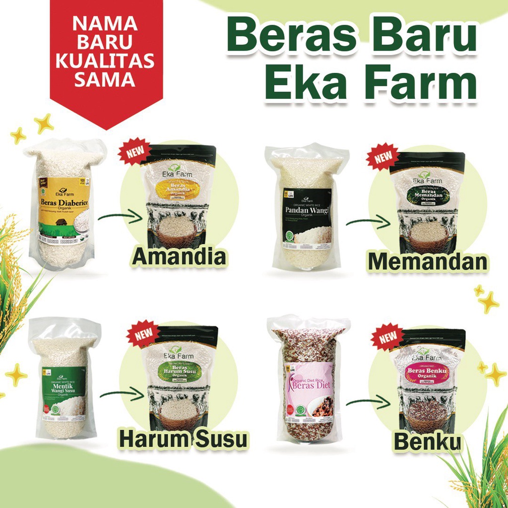 Beras Eka Farm ditanam tanpa pupuk & pestisida kimia, melainkan menggunakan pupuk kandang atau pupuk olahan, dan cara alami untuk membasmi serangga & hama untuk menghasilkan beras yang enak dengan kualitas terbaik.