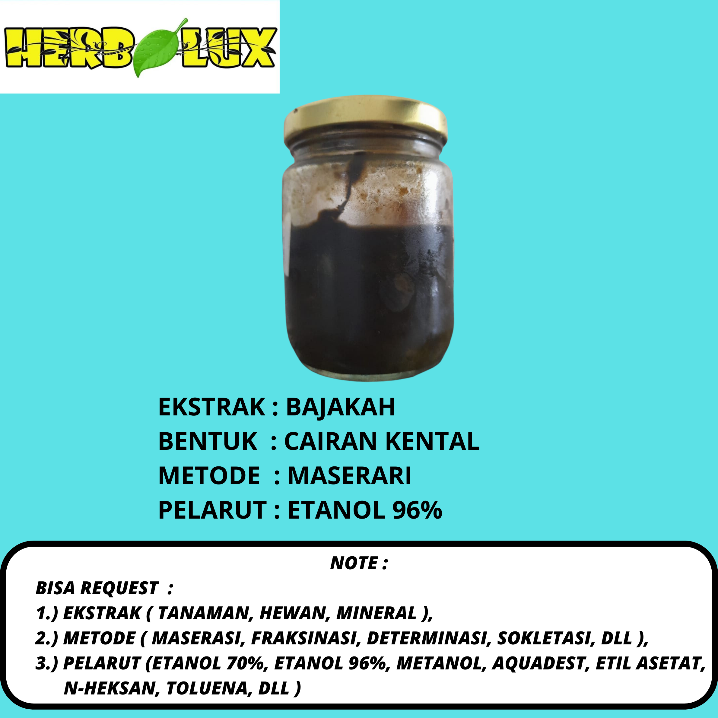 HERBALUX adalah Perusahaan yang bergerak dibidang Produk Inovatif. Terdiri dari Custom Ekstrak dan Serbuk. Menggunakan Metode Maserasi 3 x 24 jam Nama : Ekstrak Bajakah Berat : - 5 gram include ( Determinasi ) - 10 gram include ( Determinasi ) - 50 gram include ( Determinasi, Kadar Air, Kadar Abu ) - 100 gram include ( Determinasi, Kadar Air, Kadar Abu, Skrining, Fitokimia ) Menggunakan pelarut : 1. Etanol 70% 2. Etanol 96% 3. Methanol Silahkan dipilih untuk Pelarutnya.