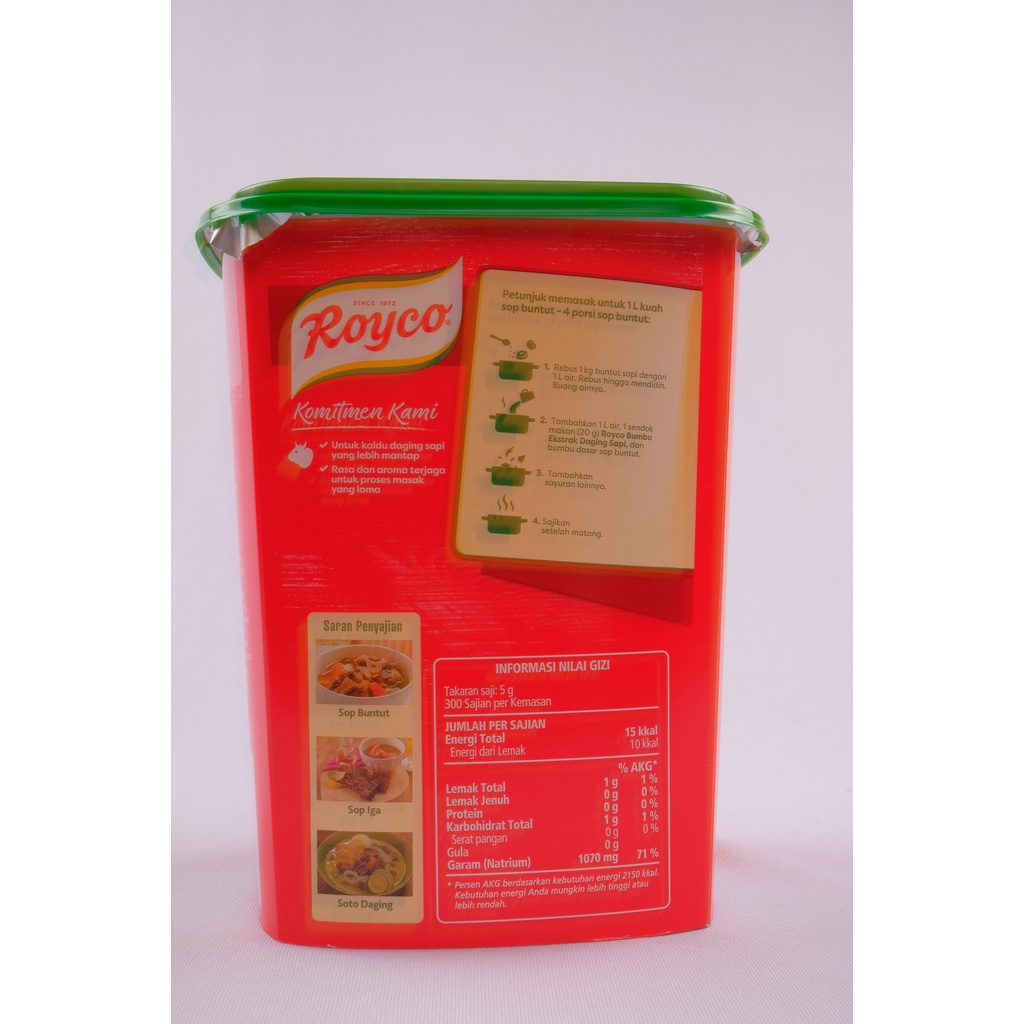 Dibuat dengan campuran daging sapi dan lemak sapi pilihan, serta rempah-rempah khas Indonesia dalam bentuk pasta yang mudah diaplikasikan. Mengandung 4x lebih banyak kandungan lemak sapi vs Royco Bumbu Pelezat Serbaguna Rasa Sapi, sehingga dapat memperkuat dan memperkaya aroma dan citarasa daging sapi pada masakan berkuah/ kaldu sapi Anda.