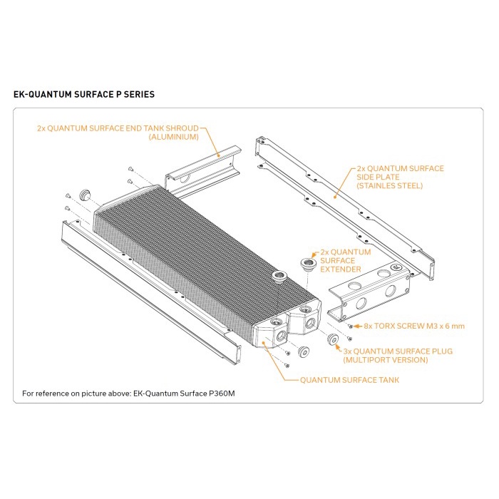 Enclosed: - EK-Quantum Surface P series radiator - 12x Phillips Slotted M4x30mm for 25mm thick fans - 12x Phillips Slotted M4x5mm for mounting the radiator directly to the case - 6mm steel Allen (Hex) key - 9mm steel Allen (Hex) key