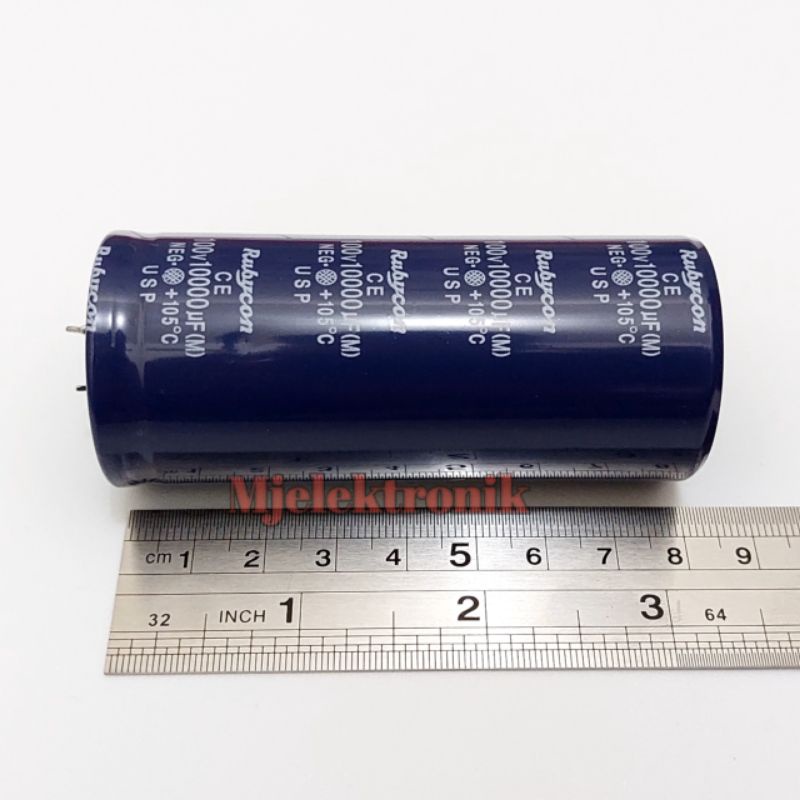 Elco Rubycon 10000uF 100V kualitas bagus untuk terapan PSU pada audio power amplifier., Ukuran elco, tinggi 8 cm dan diameter 3,5 cm.