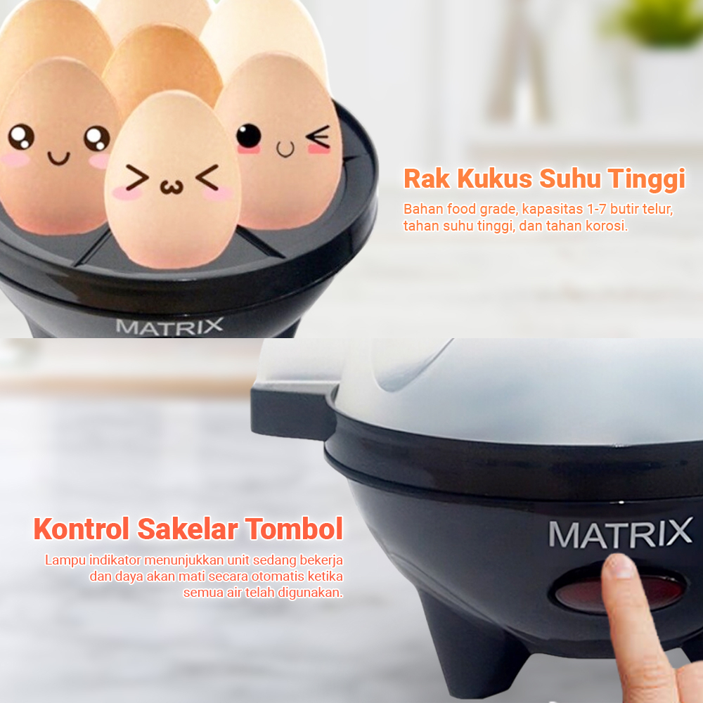 Merebus telur bulat ataupun membuat poached egg bisa digunakan menggunakan perebus dari Halluna ini. Anda pun bisa mengatur tingkat kematangan telur sesuai selera, cukup dengan menyesuaikan tingkat takaran air yang digunakan untuk merebus ( 40 ml untuk telur setengah matang, 80 - 100 ml untuk telur rebus matang). Alat ini dilengkapi tray untuk merebus maksimal 7 butir, dan cup untuk menakar air rebusan.
