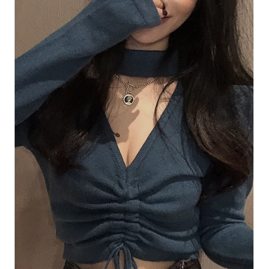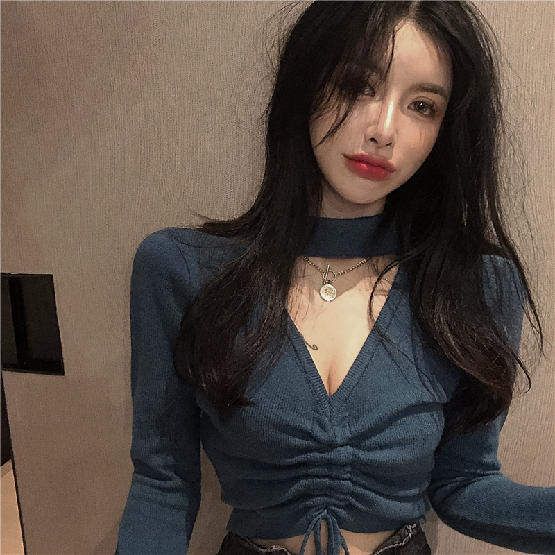 Detail 【Elegant】Knitwear Short Solid Color Halter Cropped Tops 2119