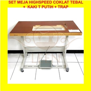 SET Meja High Speed Coklat TEBAL + Kaki T PUTIH Trap Mesin Jahit Highspeed LEEN