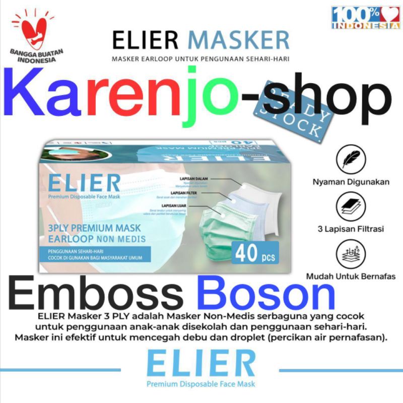 Masker ELIER memiliki 3 lapisan filtrasi dengan serat bermaterial khusus. Terbuat dari bahan non-woven sehingga tidak mudah menyerap air. Dilengkapi tali earloop yang elastis serta kawat penyangga hidung yang fleksible agar nyaman saat masker ini digunakan.