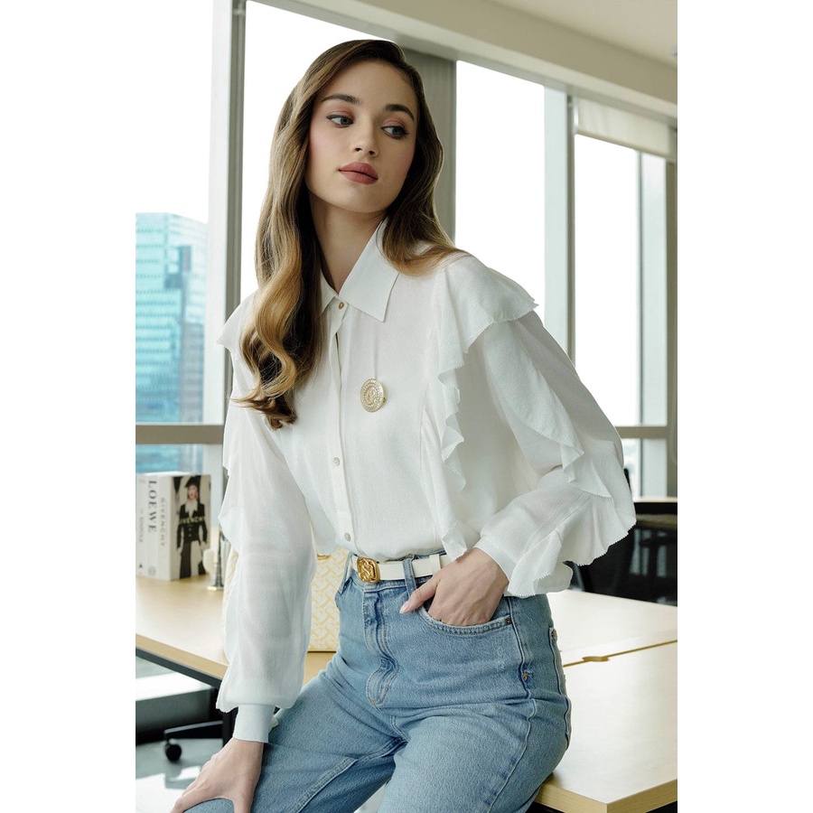 Elevate your formalwear collection with this contemporary shirt. Defined by the ruffle trims, a sharp collar, and a slightly loose fit, this piece aptivates with its fusion of feminine and assertive influences, making for an exciting addition to your well-curated wardrobe.