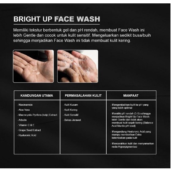 MANFAAT BRIGHT UP FACE WASH - Mengembalikan kulit ke pH yang lebih optimal. - Membersihkan kulit wajah dari polusi, kotoran, dan minyak secara menyeluruh. - Melembabkan dan menjaga elastisitas kulit wajah tanpa mengiritasi kulit. - Mencerahkan kulit dan menyamarkan noda hiperpigmentasi. - Low pH (5-6).