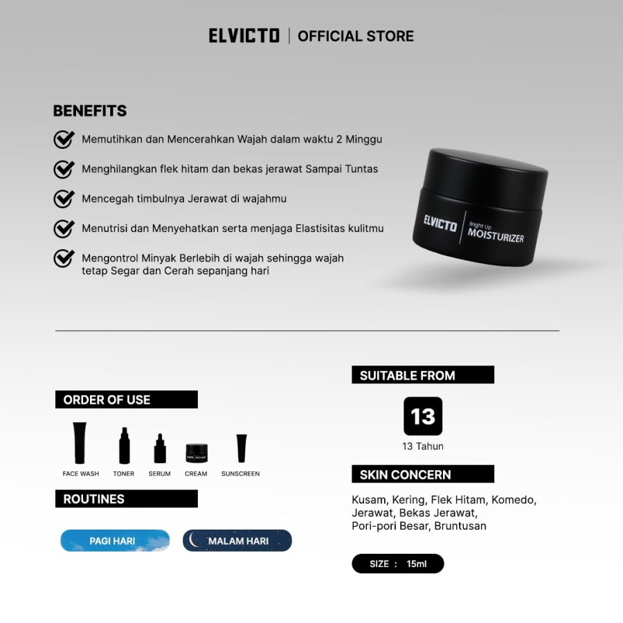 🔘 Elvicto Bright Up Moisturizer 15 gr Elvicto Bright Up Moisturizer merupakan krim pencerah wajah dengan tekstur cream- gel. Cocok untuk semua jenis kulit. Dengan bahan aktif yang menjaga lapisan luar kulit agar tetap terhidrasi dengan baik, serta diperkaya dengan brightening agent yang dapat menyamarkan noda hitam serta warna tidak merata pada wajah & leher. Dapatkan tampilan kulit yang sehat, cerah & bersinar dengan menggunakan secara rutin.