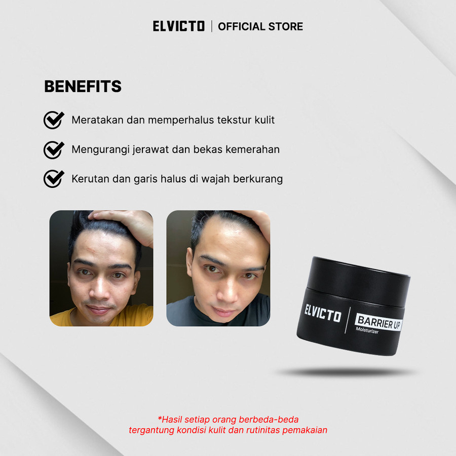 🔘 Elvicto Barrier Up Moisturizer 15 gr Elvicto Barrier Up Moisturizer adalah pelembab wajah dengan formula water based yang ringan dan mudah meresap. Memiliki kandungan Ceremide dan Hyaluronic Acid yang dapat merawat dan memperkuat skin barrier serta menjaga kelembaban kulit. Dikemas dengan Collagen dan Tocopherol yang baik untuk menjaga elastisitas kulit dan menutrisi kulit. Diperkaya dengan Centella Asiatica dan Soybean yang mampu mengatasi iritasi pada kulit.