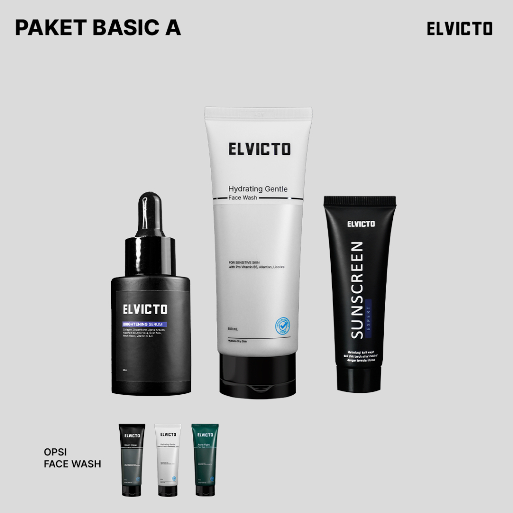 Setiap pembelian Elvicto Paket Basic, Bangbro akan mendapatkan 3 Produk Skincare Elvicto: 1. Hydrating gentle / Acne fight / Deep Clean Face Wash 2. Brightening Serum 3. Sunscreen Expert