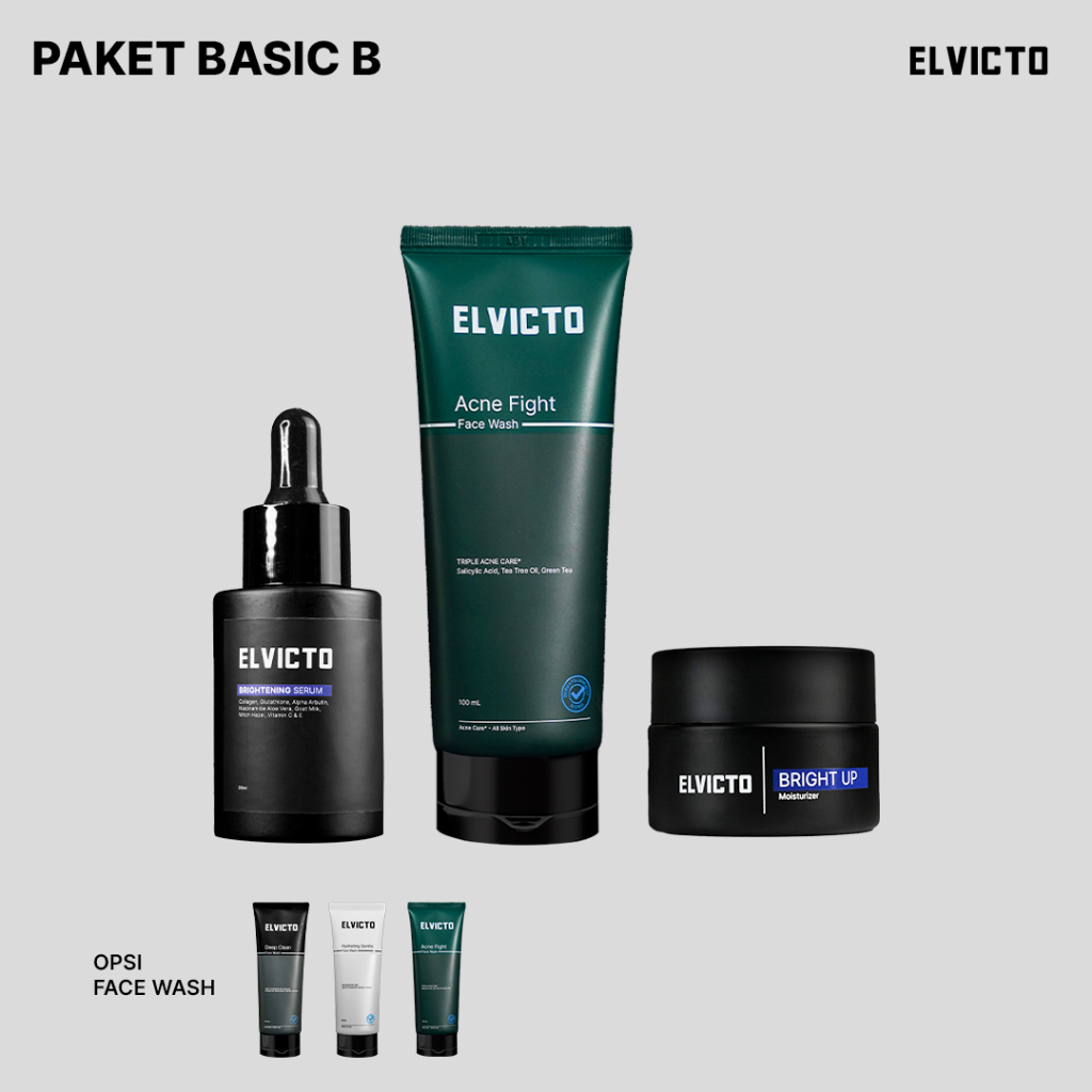 Setiap pembelian Elvicto Paket Basic, Bangbro akan mendapatkan 3 Produk Skincare Elvicto: 1. Hydrating Gentle / Acne Fight / Deep Clean Face Wash 2. Brightening Serum 3. Bright Up Moisturizer