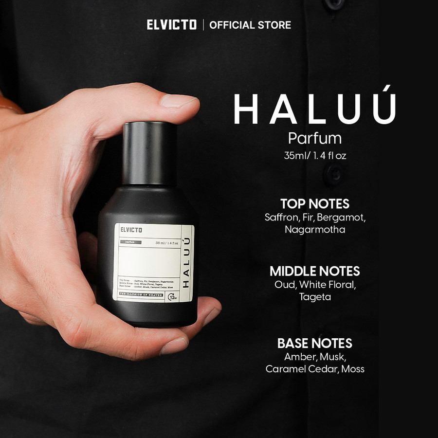 🔘 Elvicto Haluú Parfum 35 ml Elvicto Haluú Parfum mampu membangkitkan kekuatan imajinasi dengan mewakili momen antara mimpi dan kenyataan yang mampu untuk menggambarkan sesuatu yang kita inginkan dan menggerakan kita untuk meraihnya.