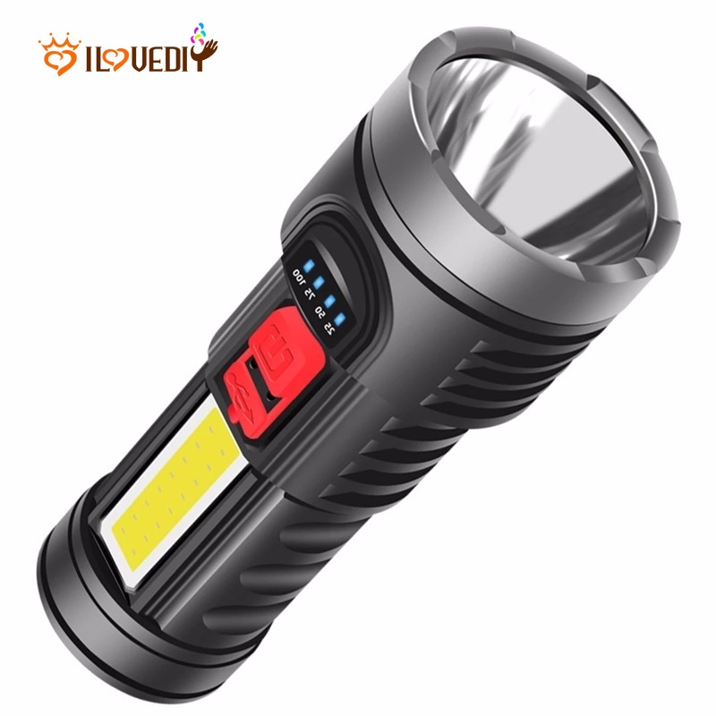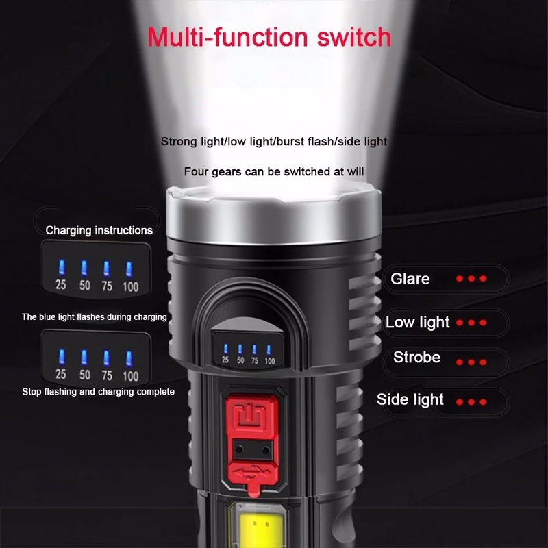 Description Strong light super long-range shooting, all-night lighting endurance, real-time power display Built-in lithium battery, USB smart flash charging COB side light illuminates a large area, a weapon for close-range lighting Multi-function switch, four gears of strong light, weak light, flash and side light can be switched at will The blue light is flashing while charging, stop flashing and charging is complete USB interface supports multiple charging methods